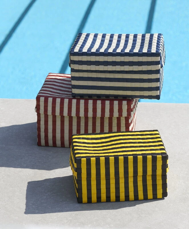HAY’s stunning Maxim Stripe boxes are designed by renowned Dutch designer and artist, Bertjan Pot. Ordinary materials are given fascinating, extraordinary form and function in Pot’s designs. The Maxim box, woven from recycled plastic strips, features a strict striped pattern that creates an interesting contrast with the tactile surface of the weave. Perfected with a matching lid, the Maxim box is as practical as it is beautiful and can be used for all kinds of storing and organizing.