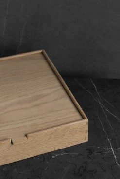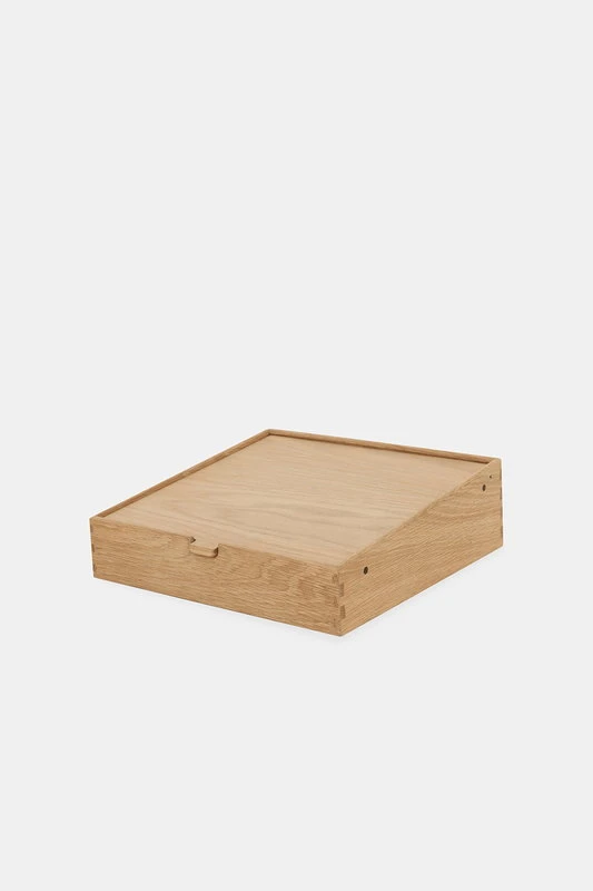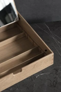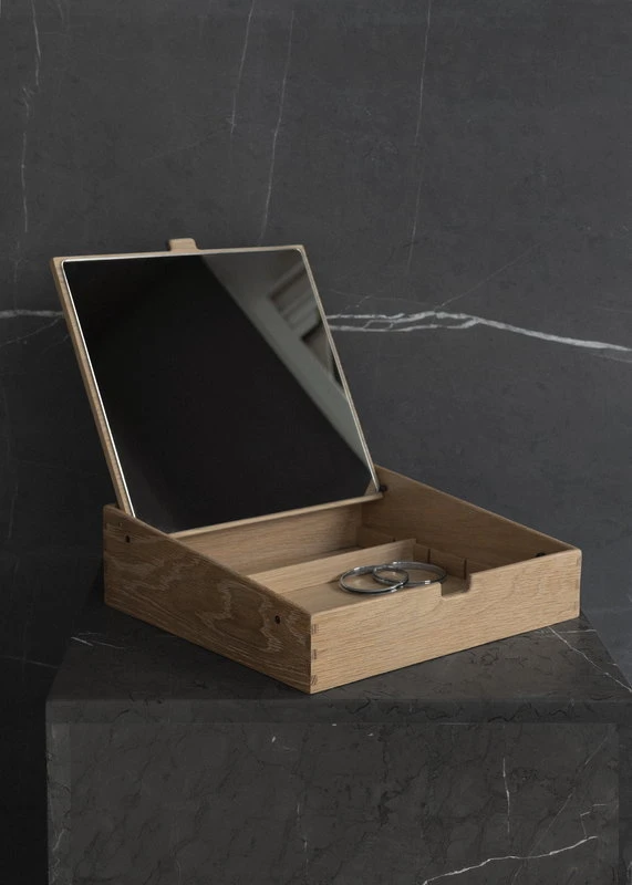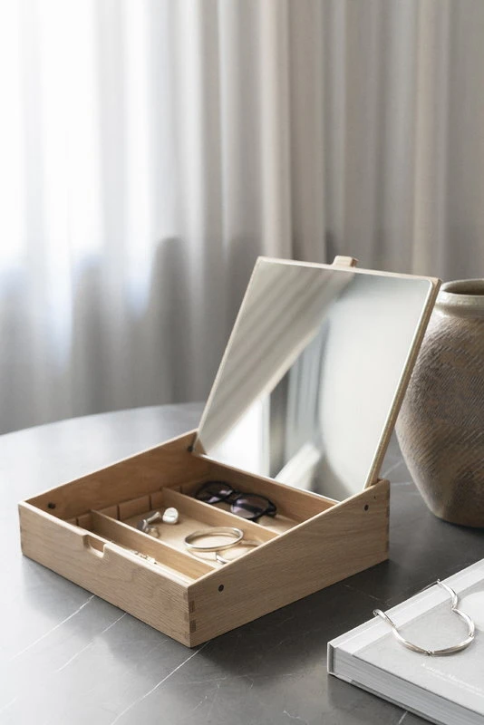 Klassik Studio’s Beauty Box is a minimalist jewellery box designed by Ejner Larsen and Aksel Bender Madsen in 1954. The Beauty Box, measuring 31 x 29 cm, is made of oiled oak, with a beautiful natural grain and exposed finger joints that accentuate the organic feel of the natural material as well as the delicate craftsmanship. Opening the lid reveals a generous mirror and compartments with movable dividers for your accessories.