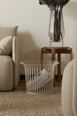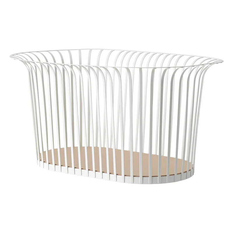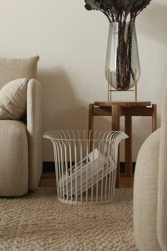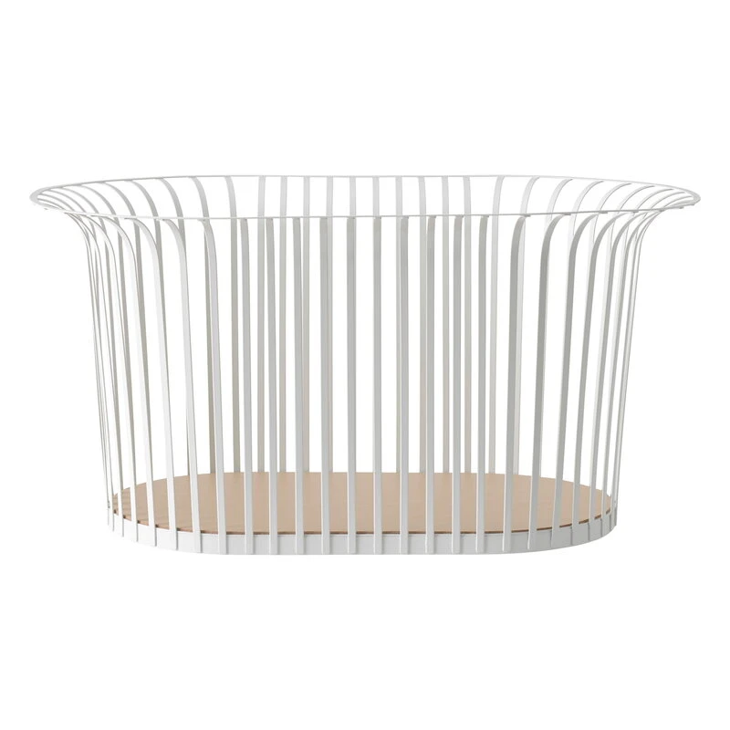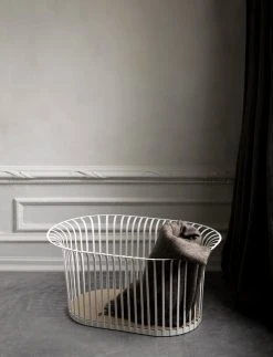 The Ribbon basket by Menu is a fascinating combination of both modern and traditional appeal: the storage basket, made of powder-coated steel, consists of thin metal strips with luxurious leather cushioning on the bottom of the basket. The top of the metal basket is softly curved so that it provides a comfortable grip when moving the basket around the house. Designed by Norm Architects, the Ribbon basket is finished with a silicone base, which holds the basket firmly in place and at the same time protects the floor from scratches.