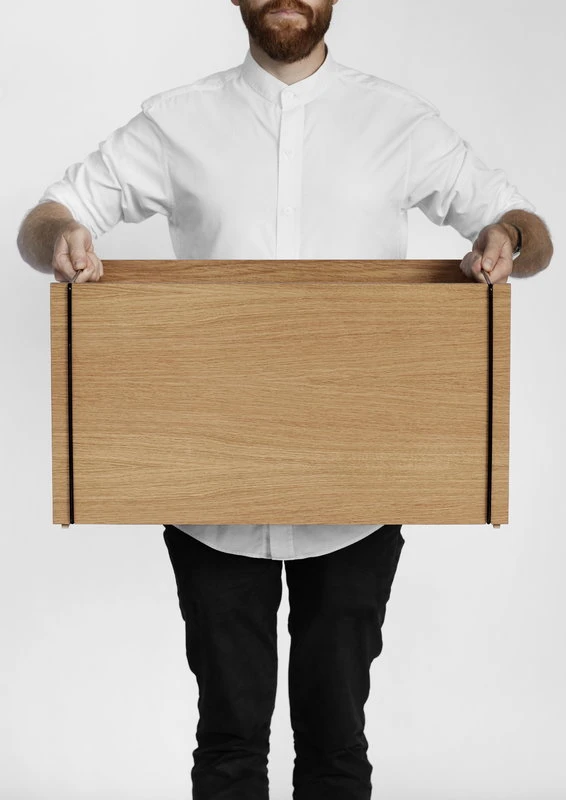 Moebe’s storage box provides a minimalist, elegant setting for storing magazines, toys, cushions or folders. The box is stackable: you can stack up to three boxes to create a space-saving storage system, the parts of which can be easily lifted off, if necessary, by grabbing the metal handles. The wooden storage box can also be turned on its side or upright to make a nightstand or small side table out of it.