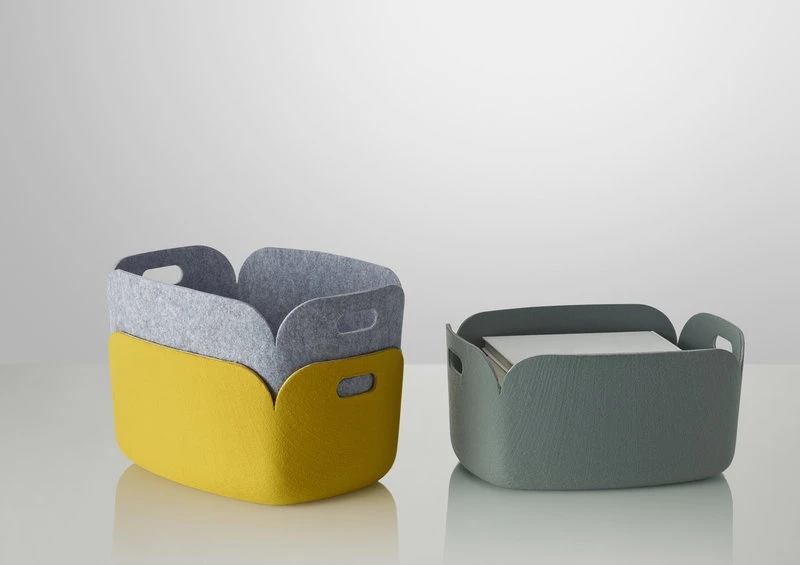 Restore, designed by Mika Tolvanen, is a collection of multifunctional trays and baskets, shaped from durable polymer felt composite. The innovative material is manufactured from the fibres of recycled bottles. Restore trays and baskets feature a simple and pleasant form that is suitable for home and office.
