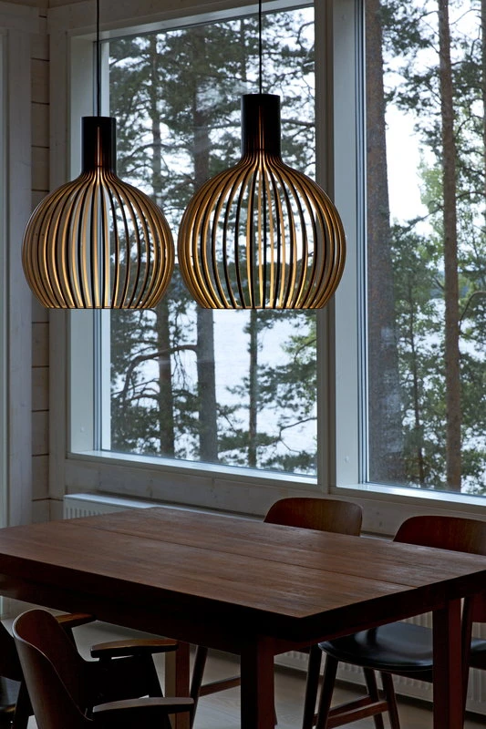 Secto Design luminaires are handmade in Finland from form-pressed Finnish birch. The lamps have clean Scandinavian silhouettes, and the wooden surface gives them a warm and appealing character. Secto lamps are designed by architect Seppo Koho who wanted to develop a softly filtering light that doesn’t dazzle but invites people to come closer. Secto lamps emphasize space and environment by creating a unique atmosphere and feeling of closeness.