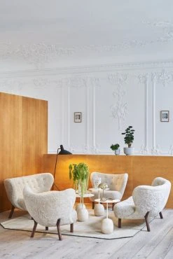 &Tradition’s Little Petra lounge chair and pouf charm with their compact size, flowing silhouette and soft sheepskin upholstery. The petite, friendly chair and pouf are a lovable example of the Danish funkis style of the 1930s.