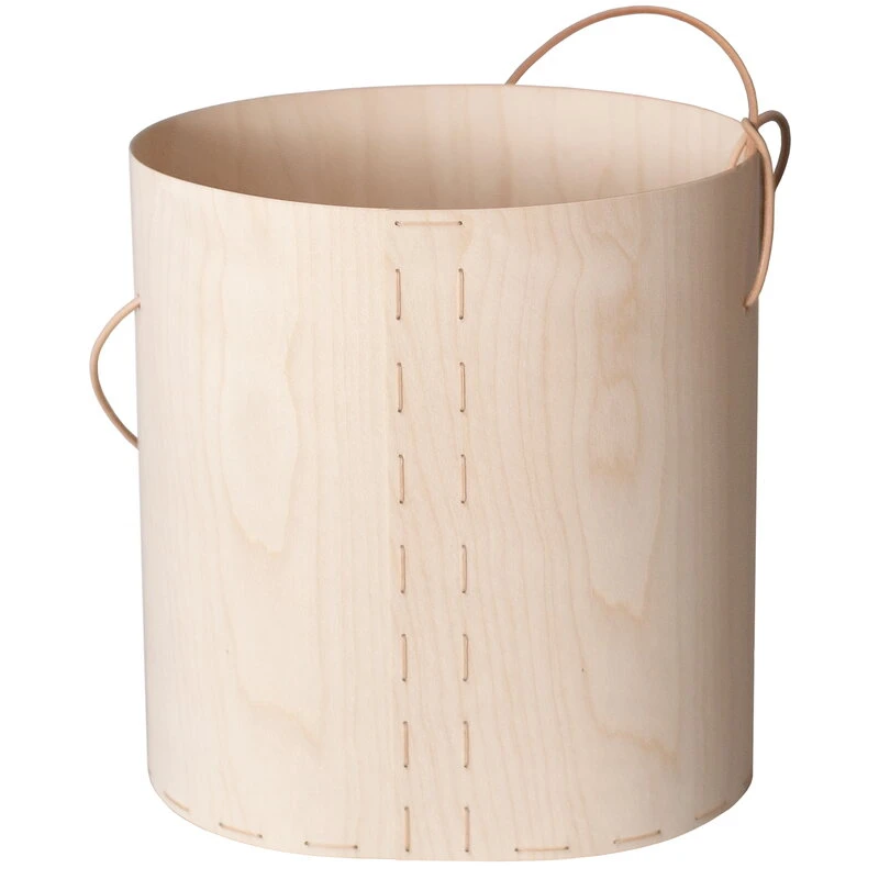 The Round basket, manufactured and designed by Tuulia Penttilä, creates a unique and multi-purpose setting for small storage. Crafted glue-free with the saddle-stitched method, the basket is made of thin birch plywood and finished with a playful leather strap. The soft-shaped design and simplistic appearance of the basket suit well for home storage or display. Due to its lightness, the Round basket travels with you also on daily errands.