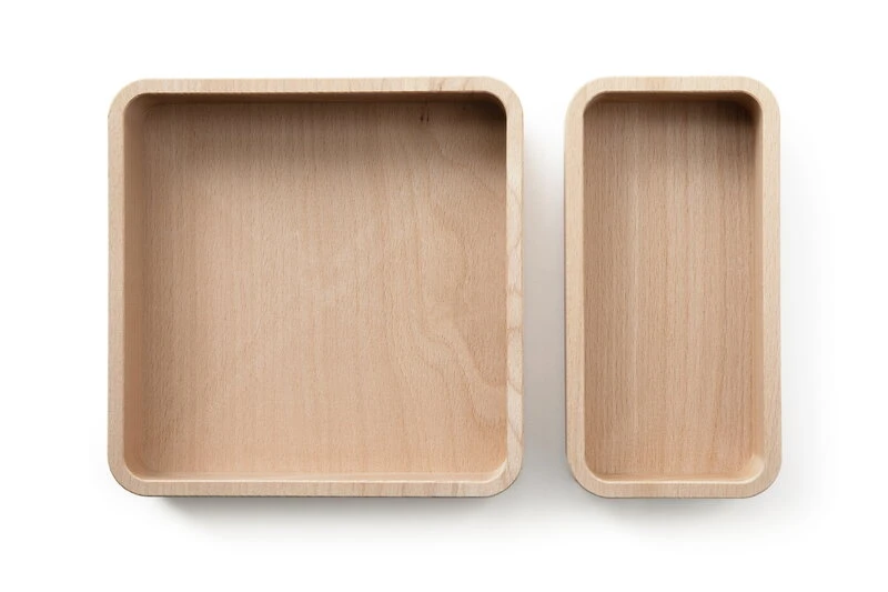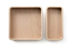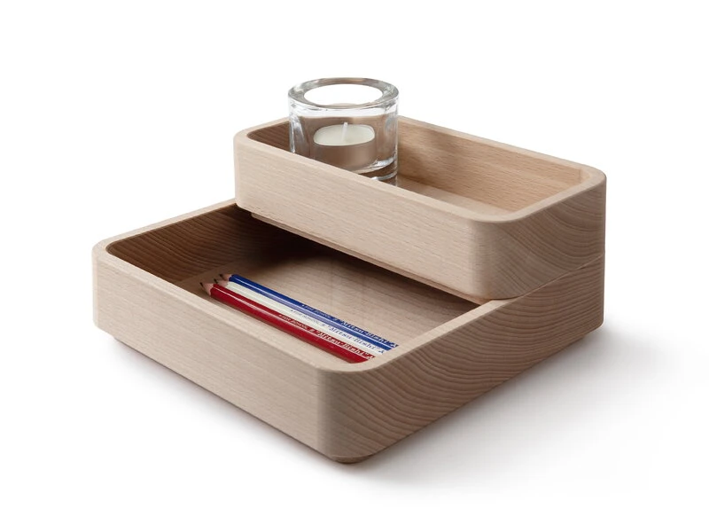 The set includes two boxes of different sizes, which can be used as trays on the desk, in the kitchen or on a bathroom countertop. The boxes can be used either together or separately, and they can be stacked to make an organizer for office supplies or other small items.